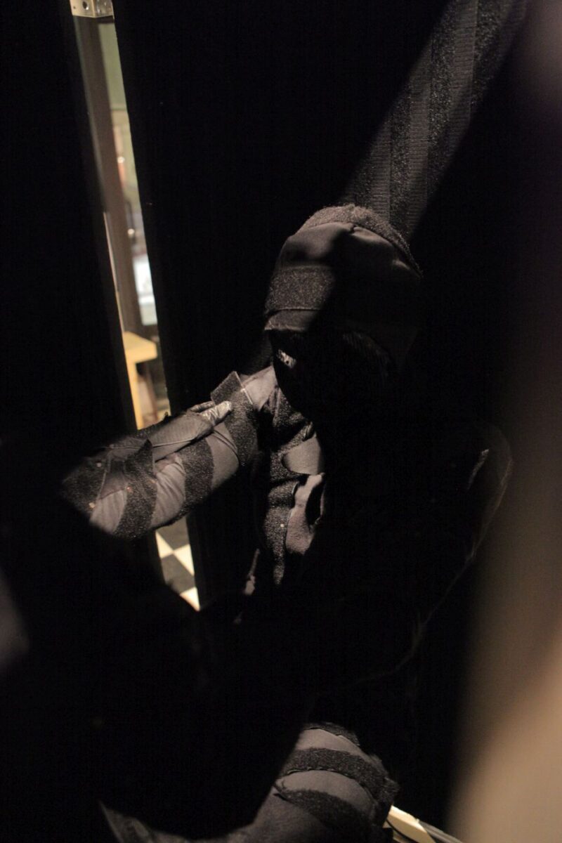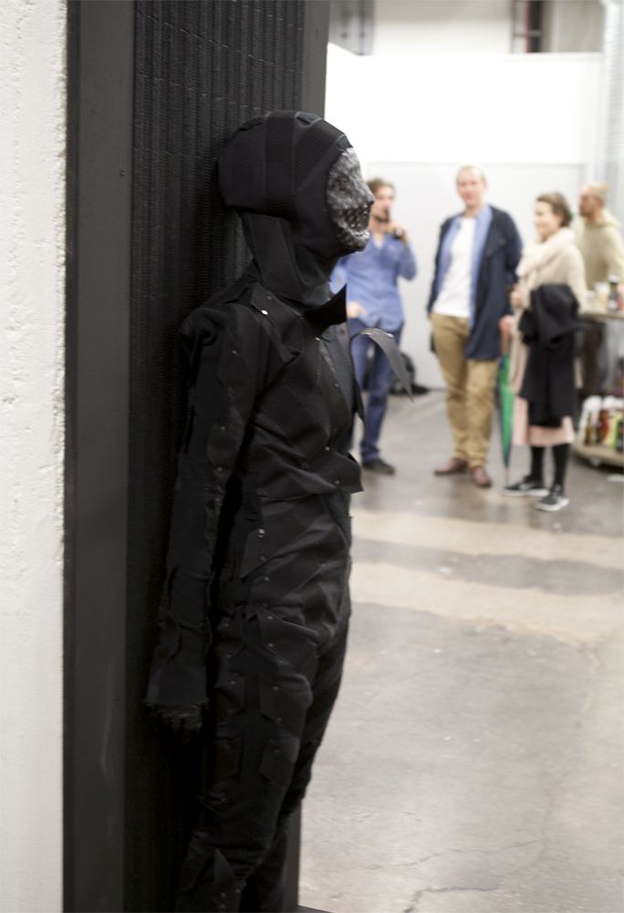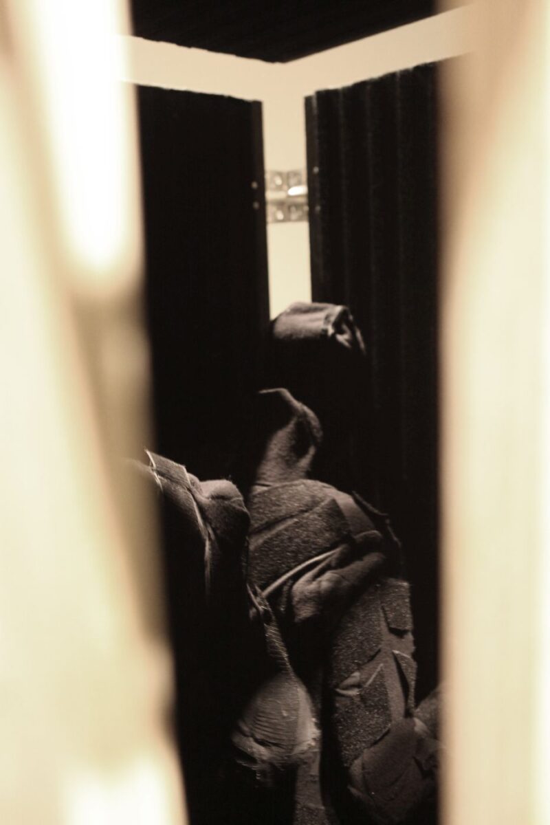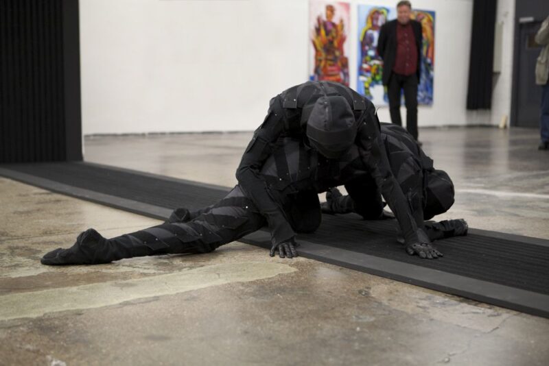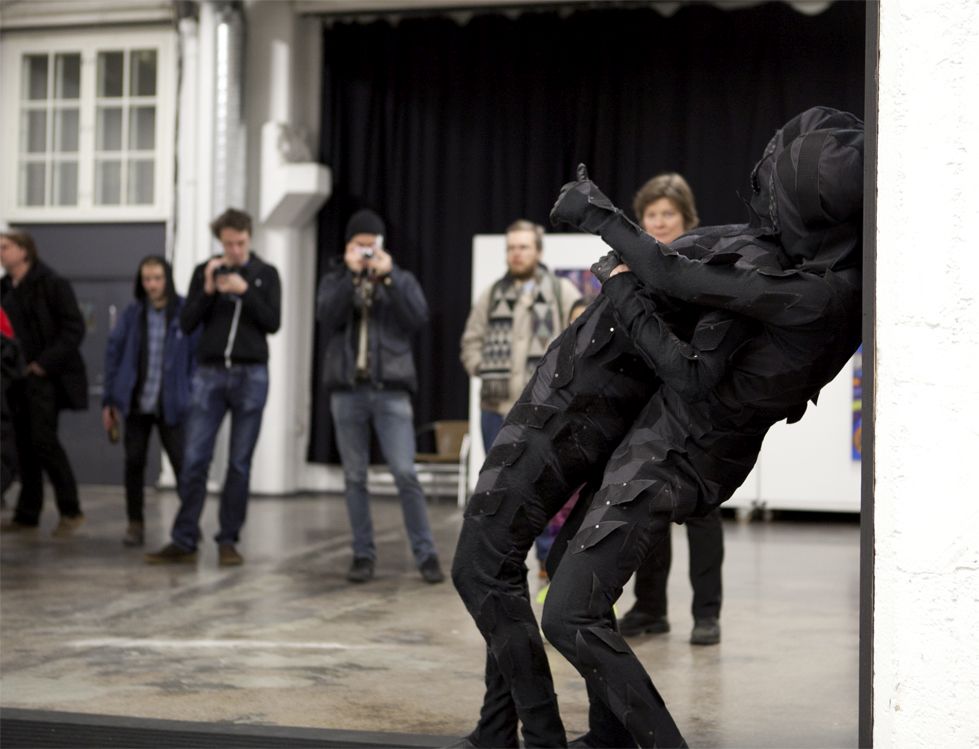 Two performers were dressed in full bodysuits consisting of Velcro. One suit contained only the rough ‘hook’ material, and the other, the soft ‘loop’ material. The platform surface on which the performance took place was also covered with both materials. The performers’ movements were dictated by the material qualities of the Velcro which created a soundscape as they tangled and untangled with each other.