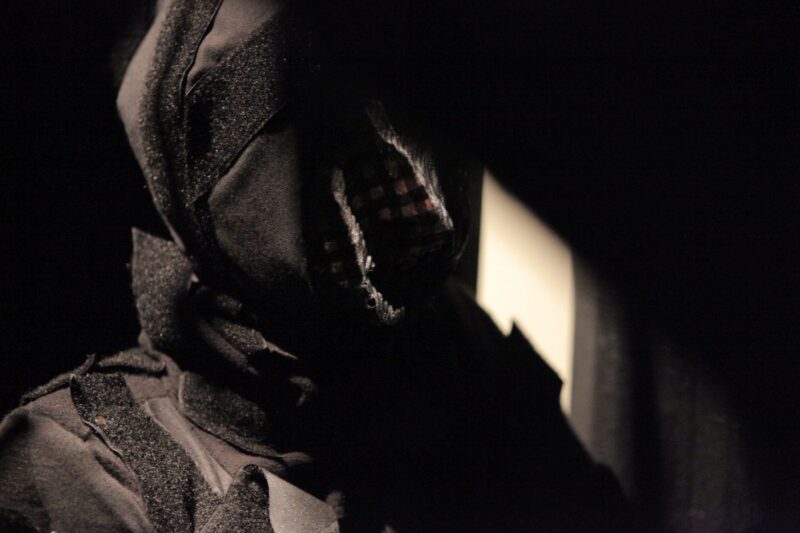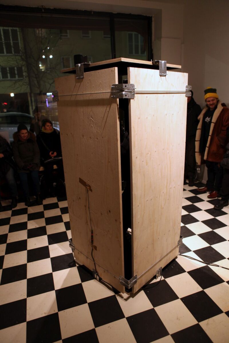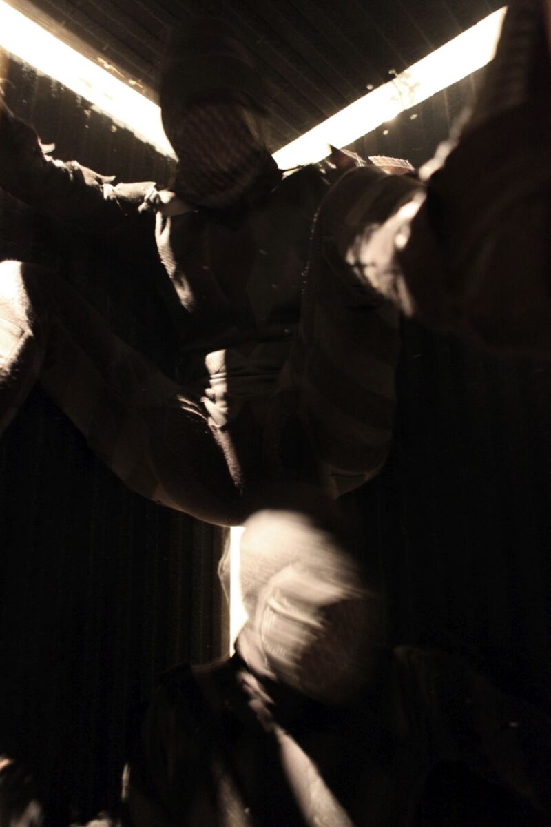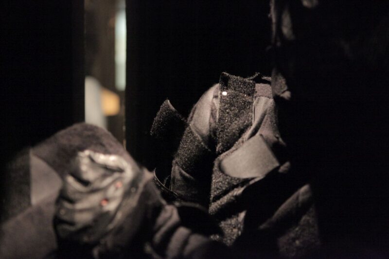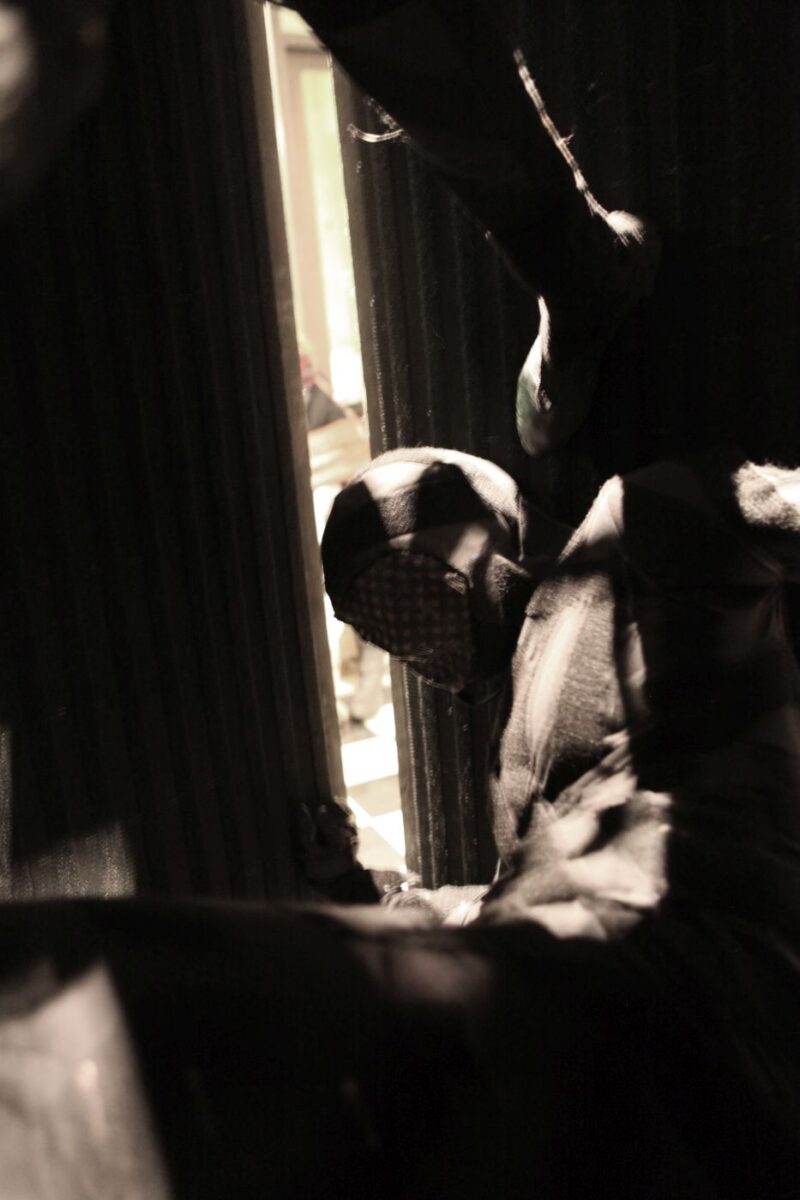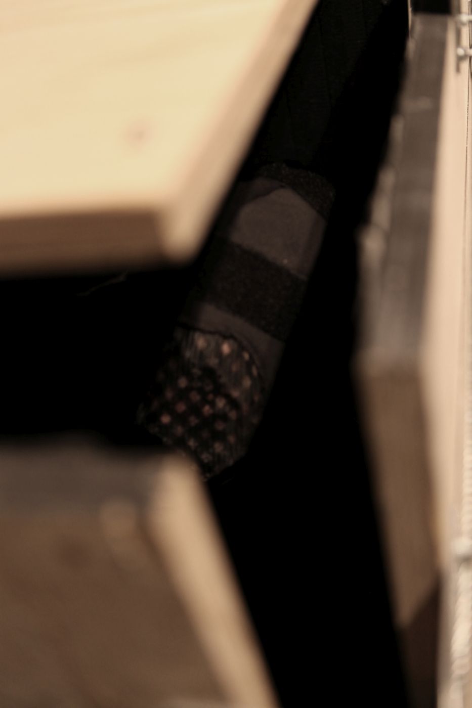 Two performers were dressed in full bodysuits consisting of Velcro. One suit contained only the rough ‘hook’ material, and the other, the soft ‘loop’ material. The platform surface on which the performance took place was also covered with both materials. The performers’ movements were dictated by the material qualities of the Velcro which created a soundscape as they tangled and untangled with each other.