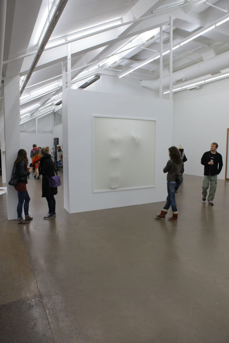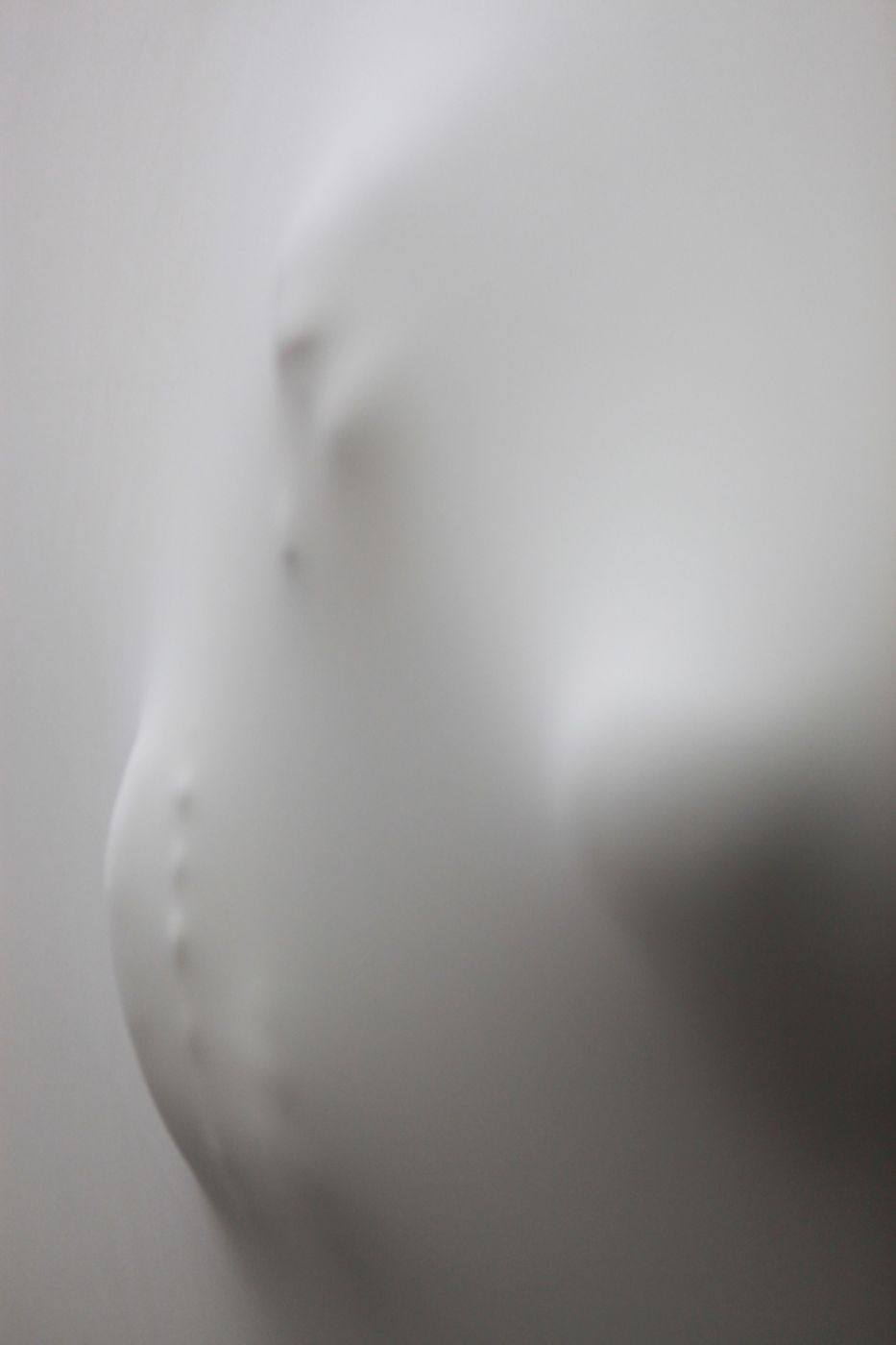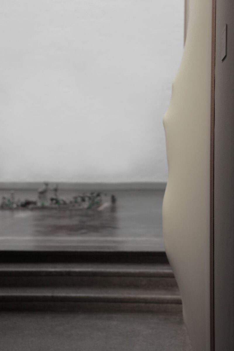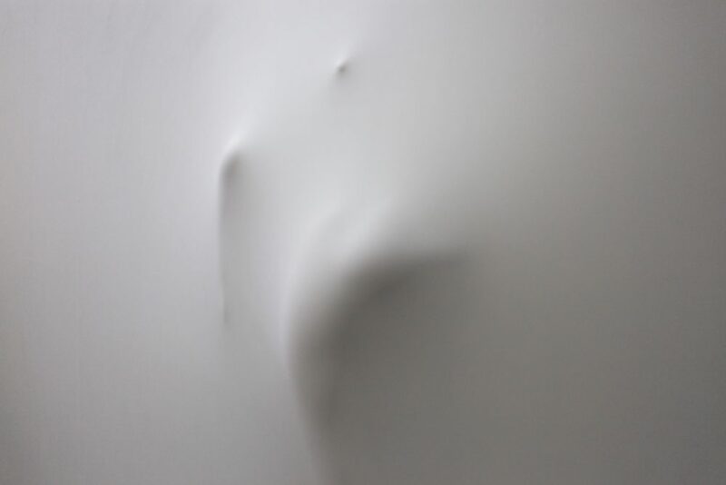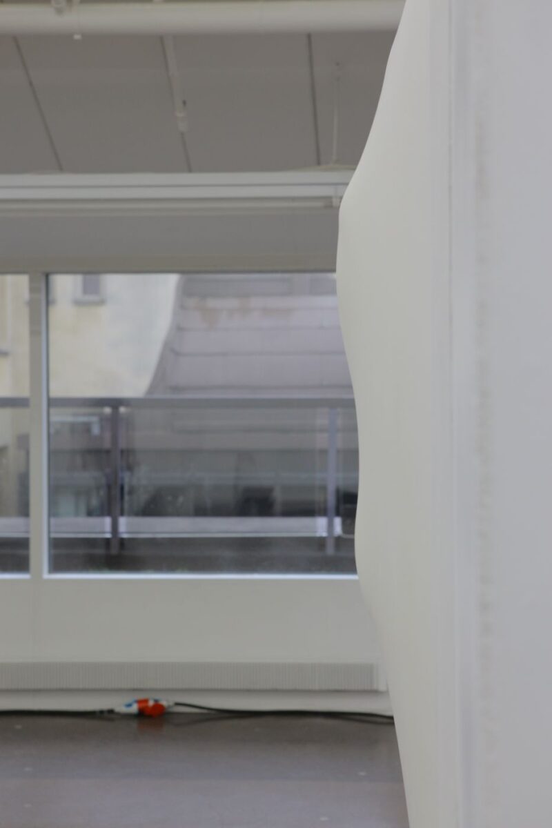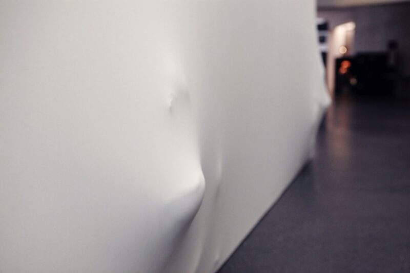 This durational performance installation consisted of a site specific construction framing a 0,32 mm rubber canvas. A hidden construction design allowed the performers to move against gravity as they intermittently appeared and disappeared behind the canvas. The material properties of the thin rubber emphasised the details and sculptural qualities of the human body, as the performers created temporary imprints and reliefs into the canvas surface.ย