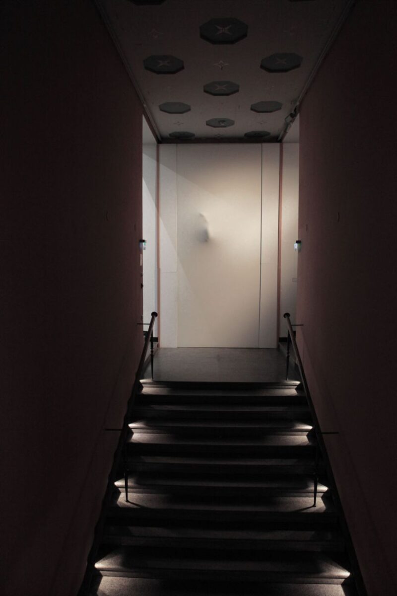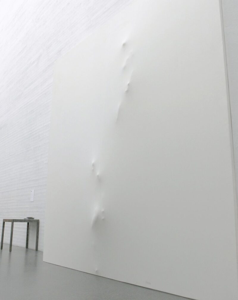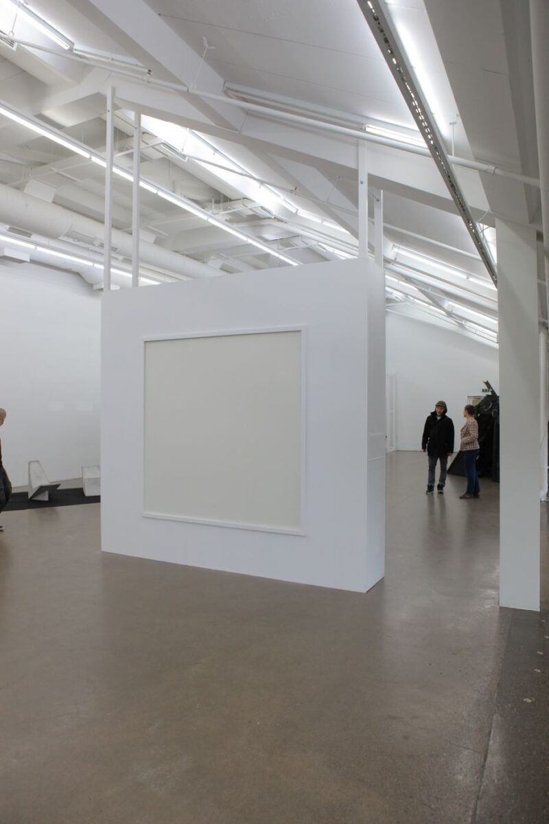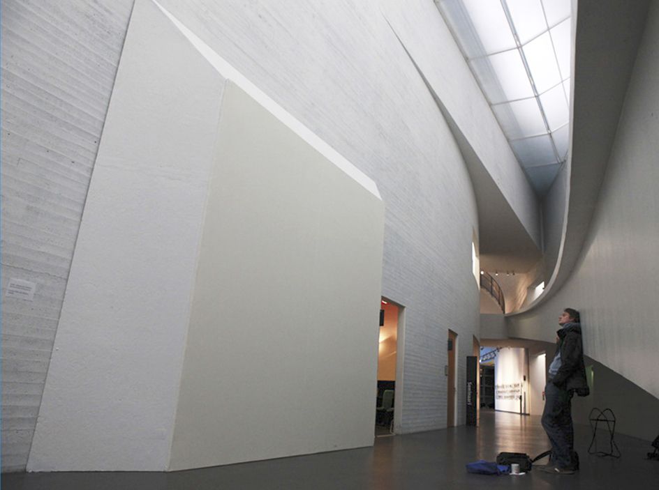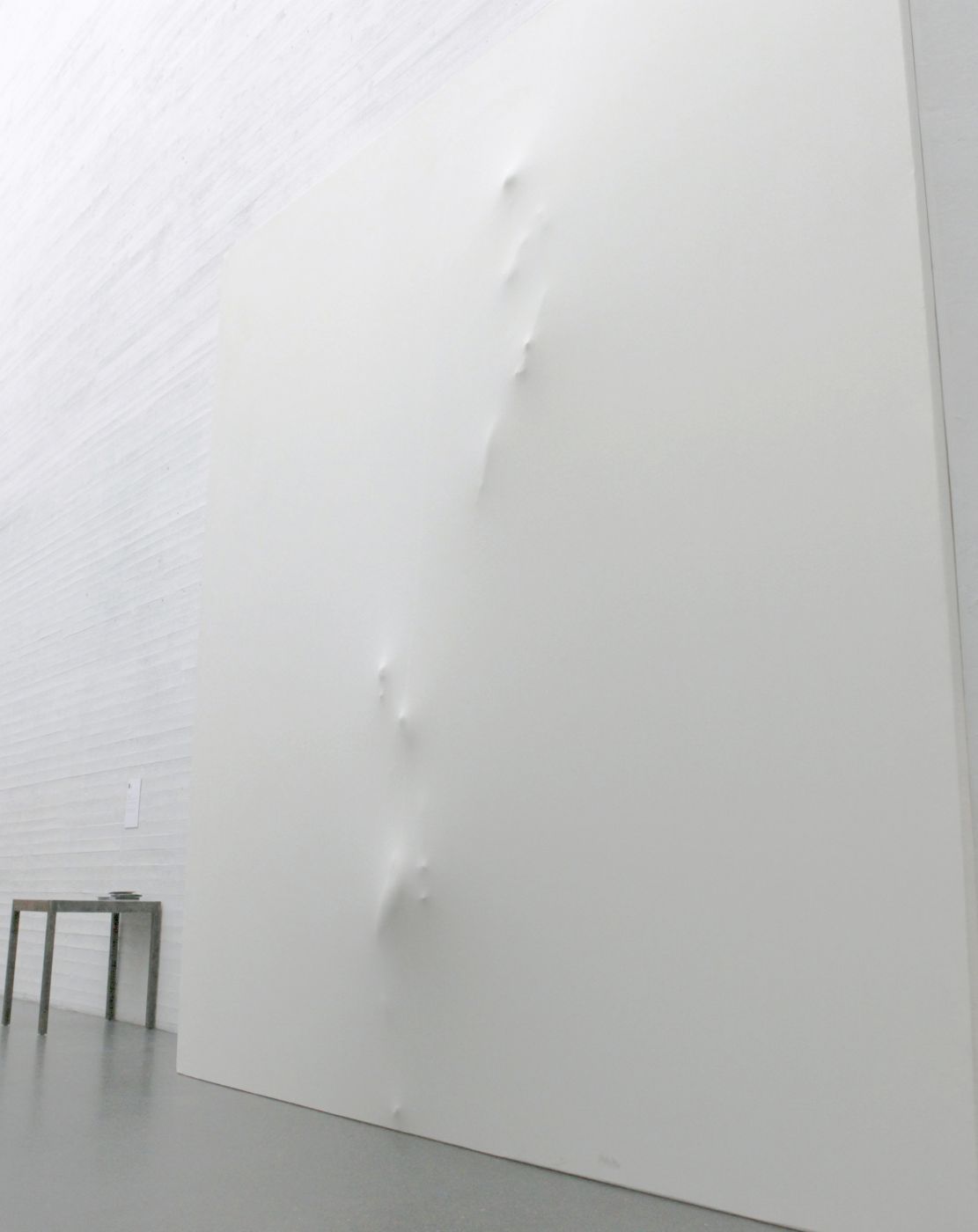 This durational performance installation consisted of a site specific construction framing a 0,32 mm rubber canvas. A hidden construction design allowed the performers to move against gravity as they intermittently appeared and disappeared behind the canvas. The material properties of the thin rubber emphasised the details and sculptural qualities of the human body, as the performers created temporary imprints and reliefs into the canvas surface.ย