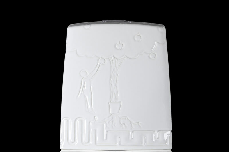Memento is a site-specific artwork that consists of five hand-engraved sculptures with an accompanying audiotrack. The artwork illustrates the cyclic journey of an apple, from tree to mouth, through the digestive tract, and back into the tree. The artwork can be experienced in Chappe Museum (Tammisaari, Finland) while using the visitor toilets.